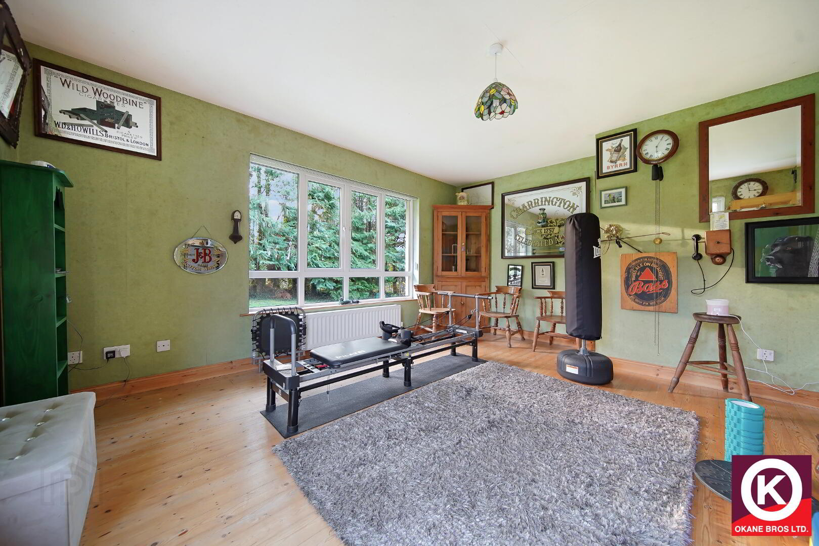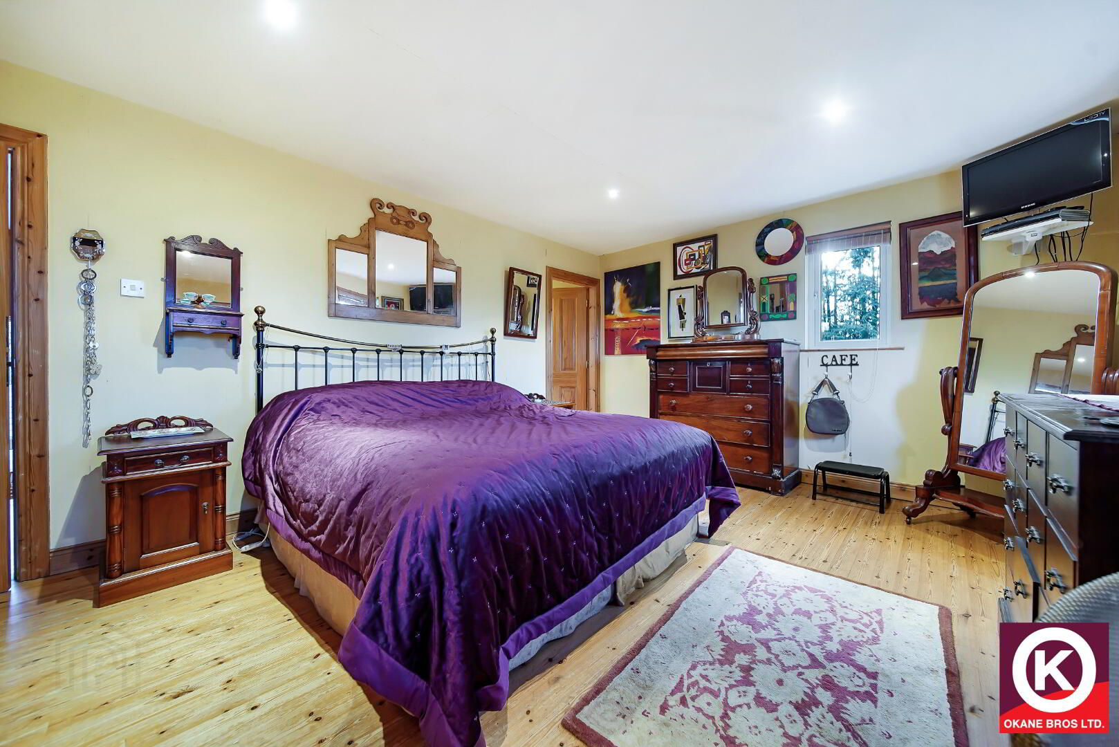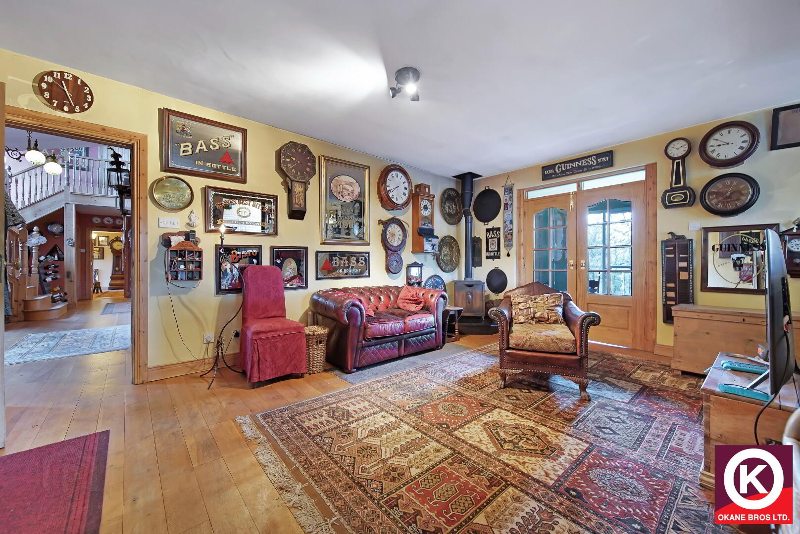 Reclaimed French oak floor covering. French doors to sunroom. Tv Point.