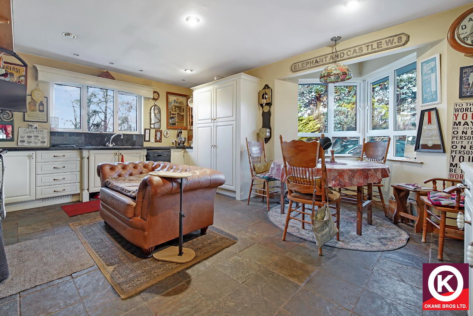 Natural slate floor covering. Fitted high and low level units. Stainless steel Sink.