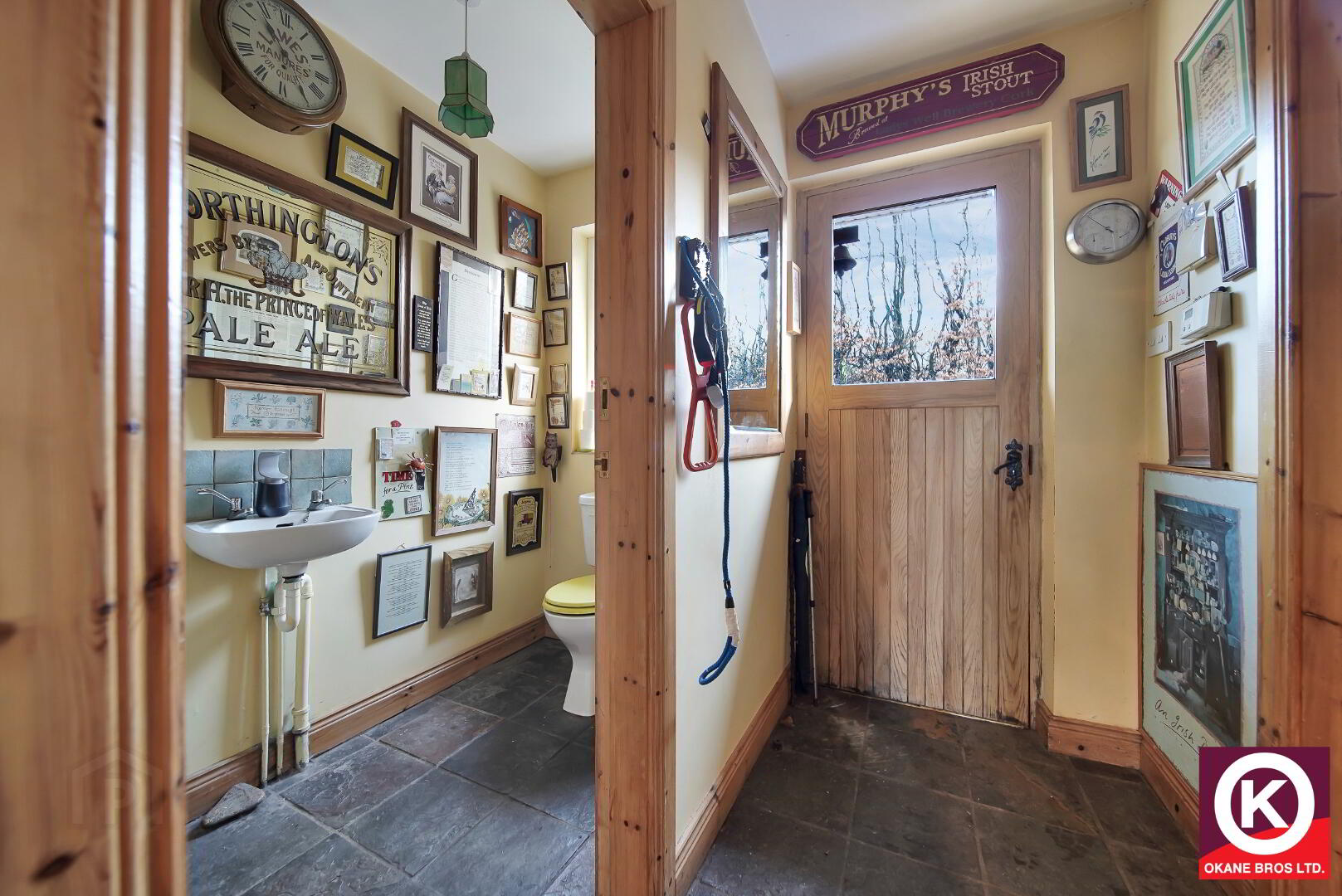 Natural slate floor covering. Wash Hand Basin. Tiled splash back. Extractor fan.