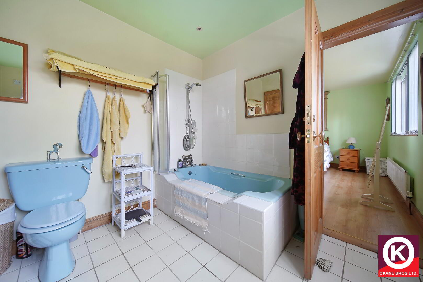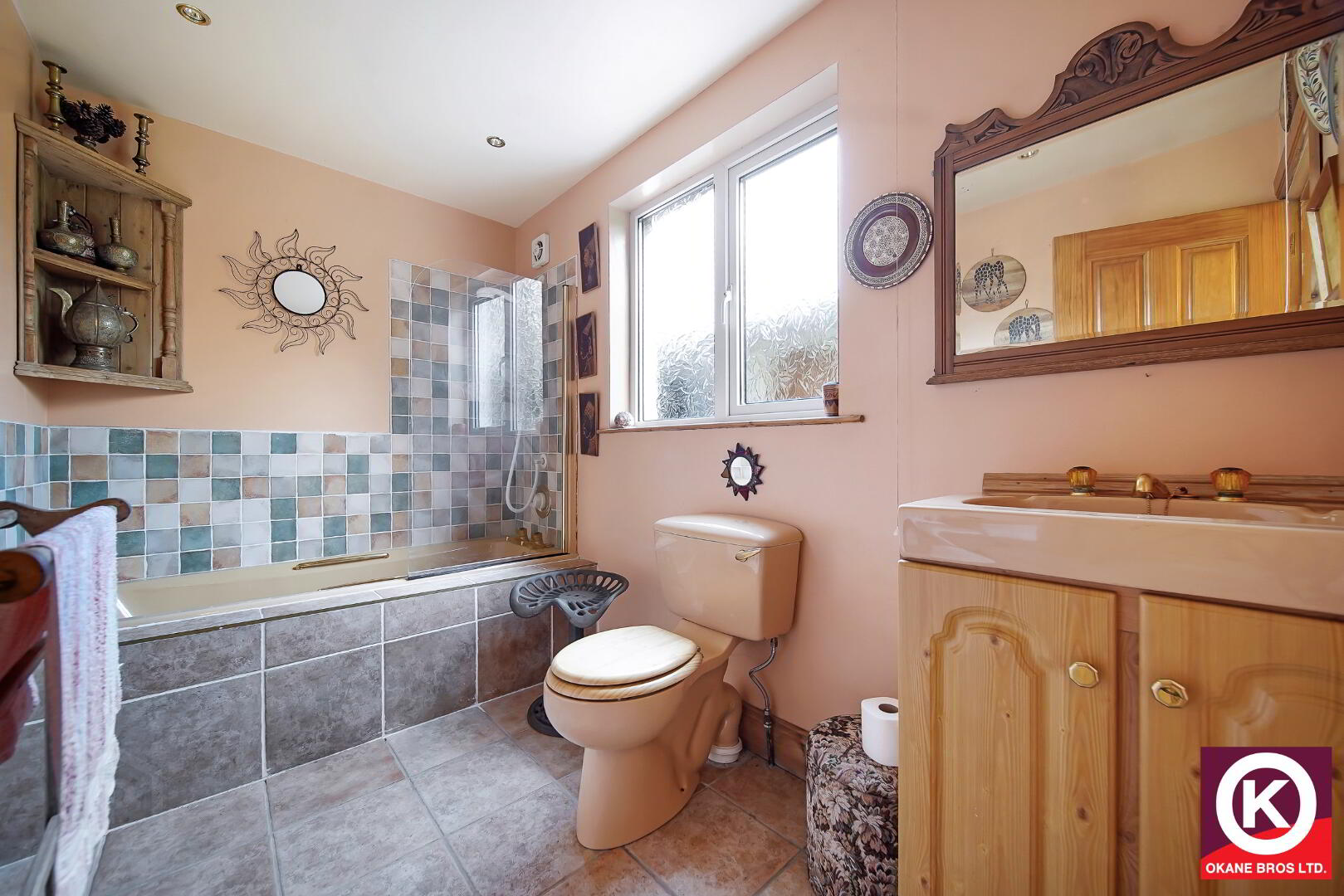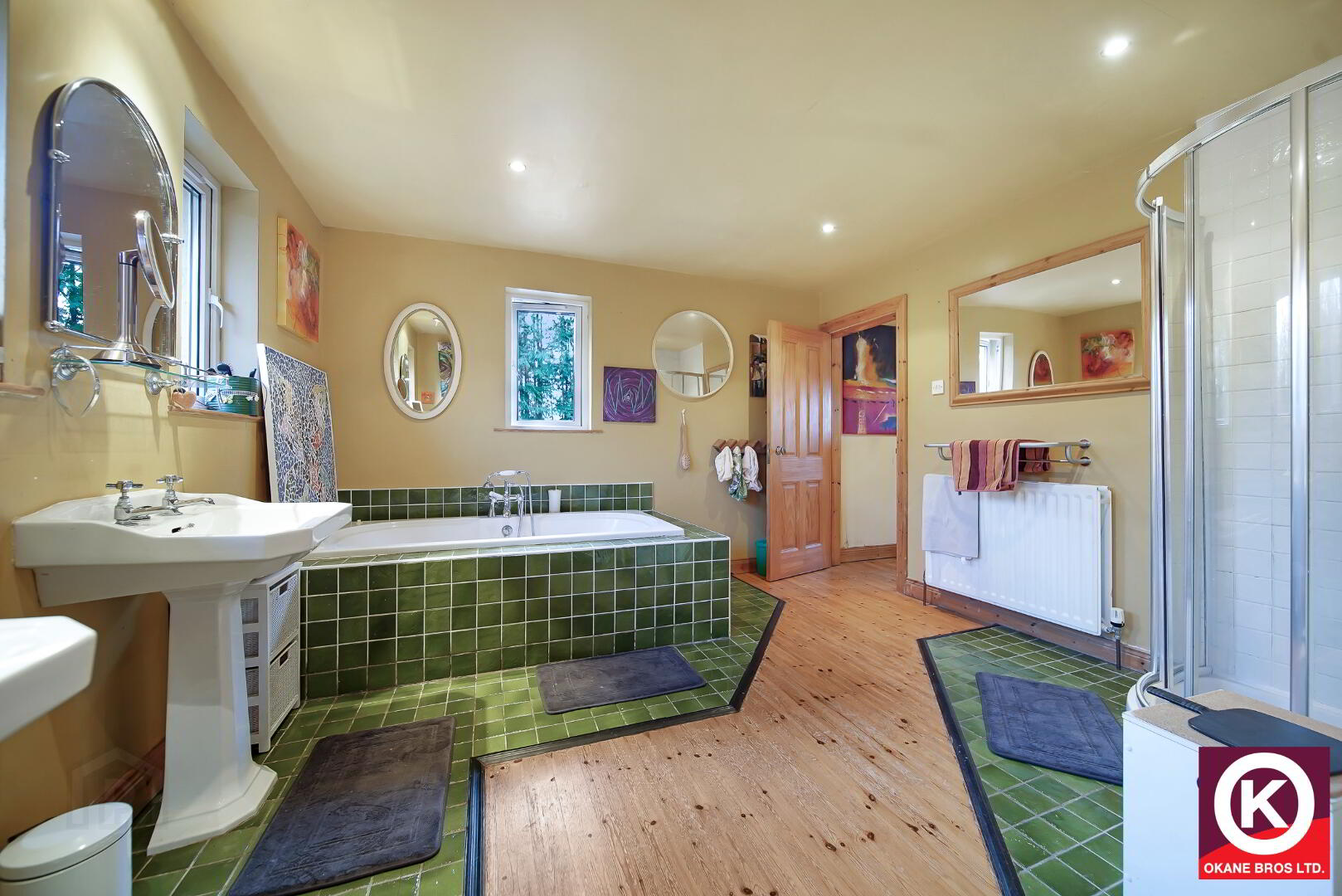 Partly tiled floor. Part wooden floor. Jacuzzi style bath. Separate mains shower. 2 No. Wash Hand Basins. Recess lighting. Extractor fan.