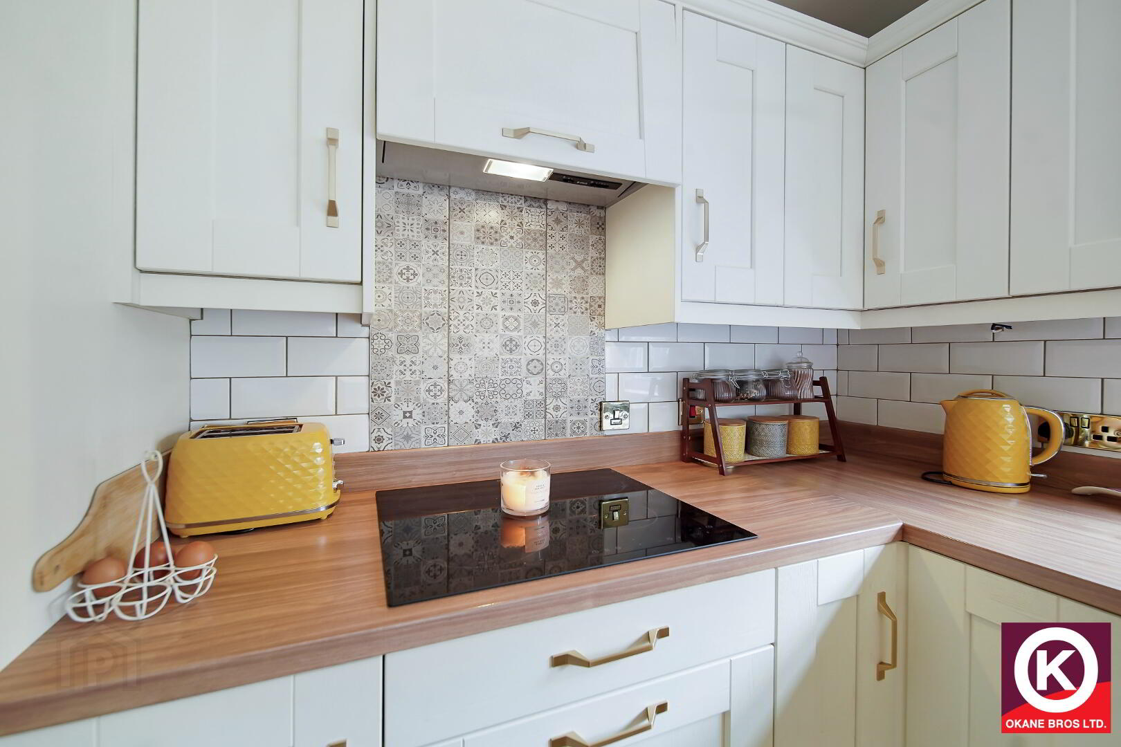 Wooden effect tiled floor covering. Plumbed for washing machine. Extractor fan. Stainless Steel Sink. High and low level units. PVC exterior door. Storage off.