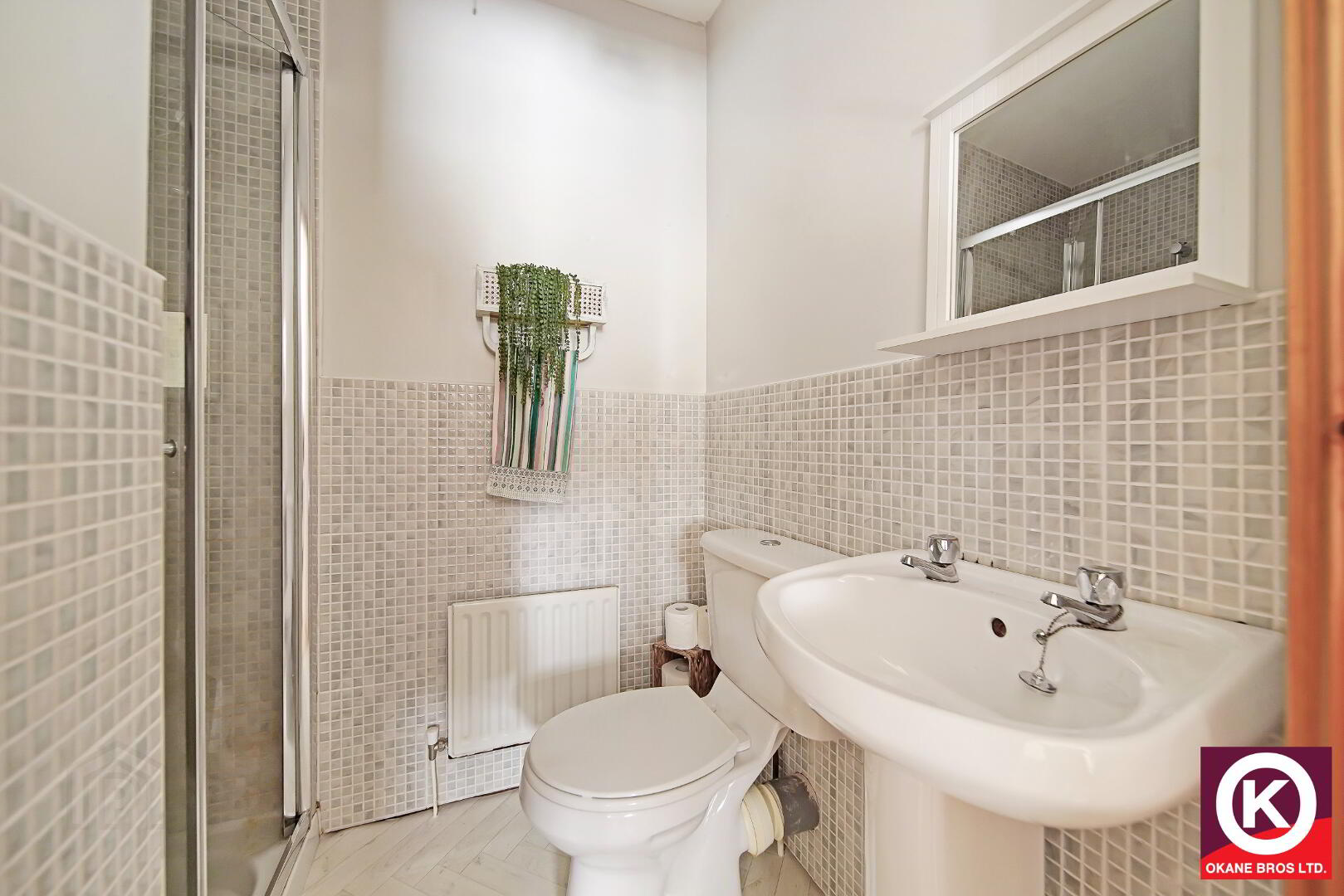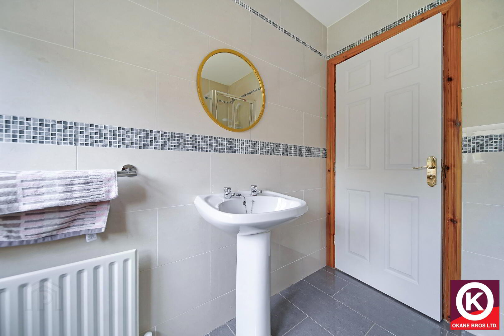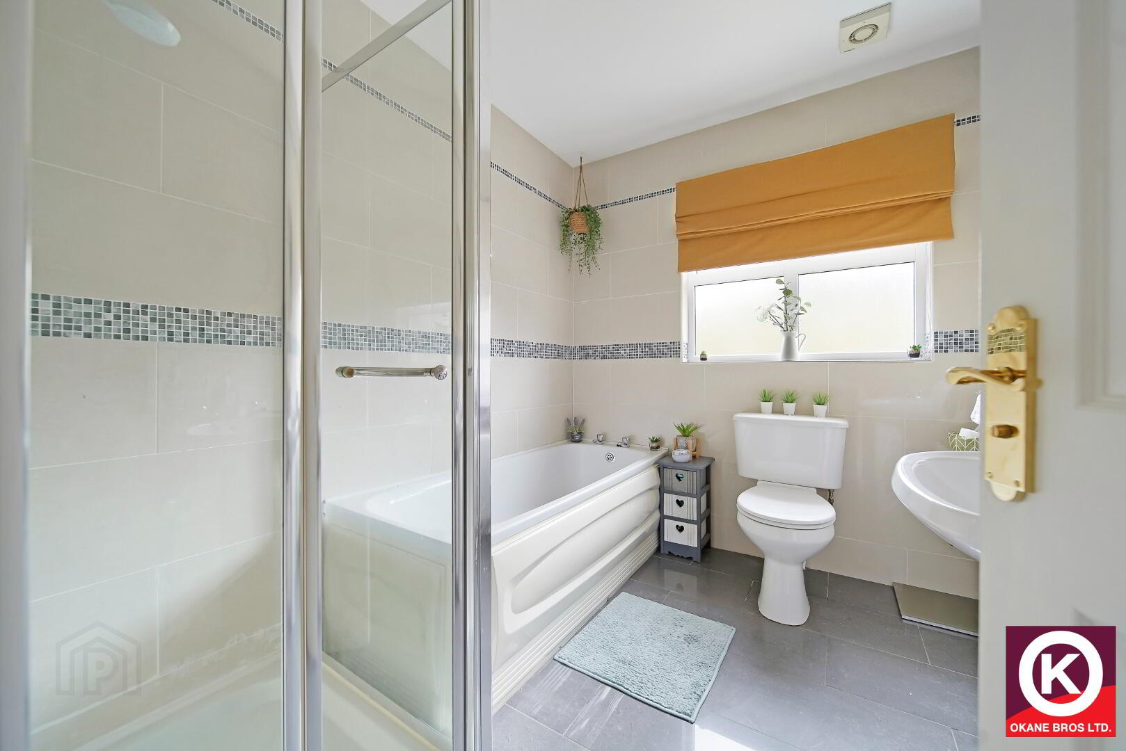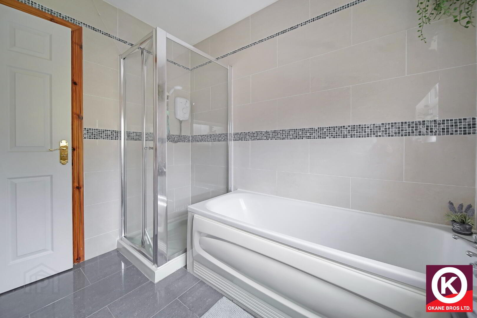 Electric shower. Separate bath. Extractor fan. Fully tiled walls. Tiled floor covering. Wash Hand Basin.