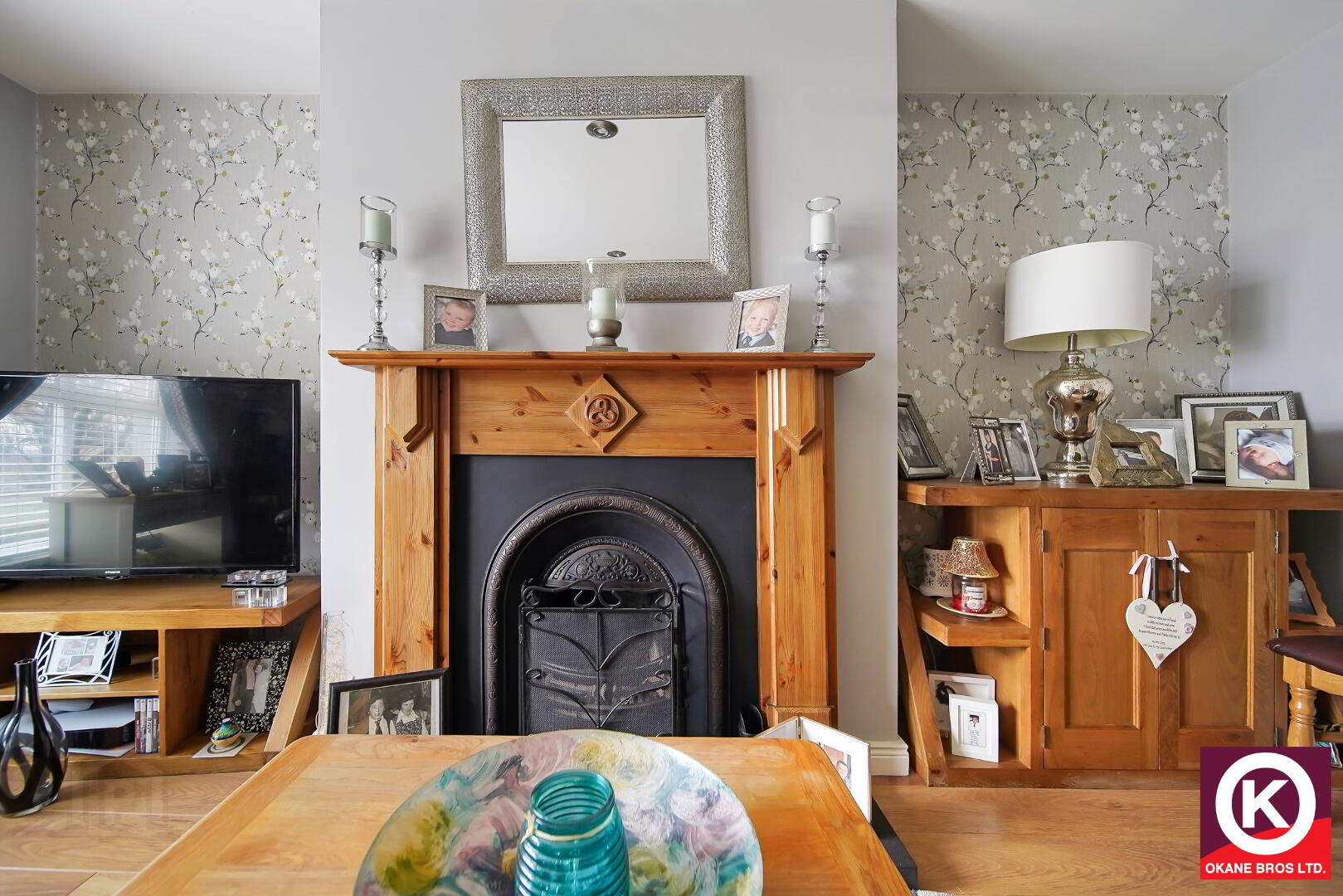 Recess lighting. TV Point. Attractive wooden surround fireplace with cast iron inset and slate hearth.