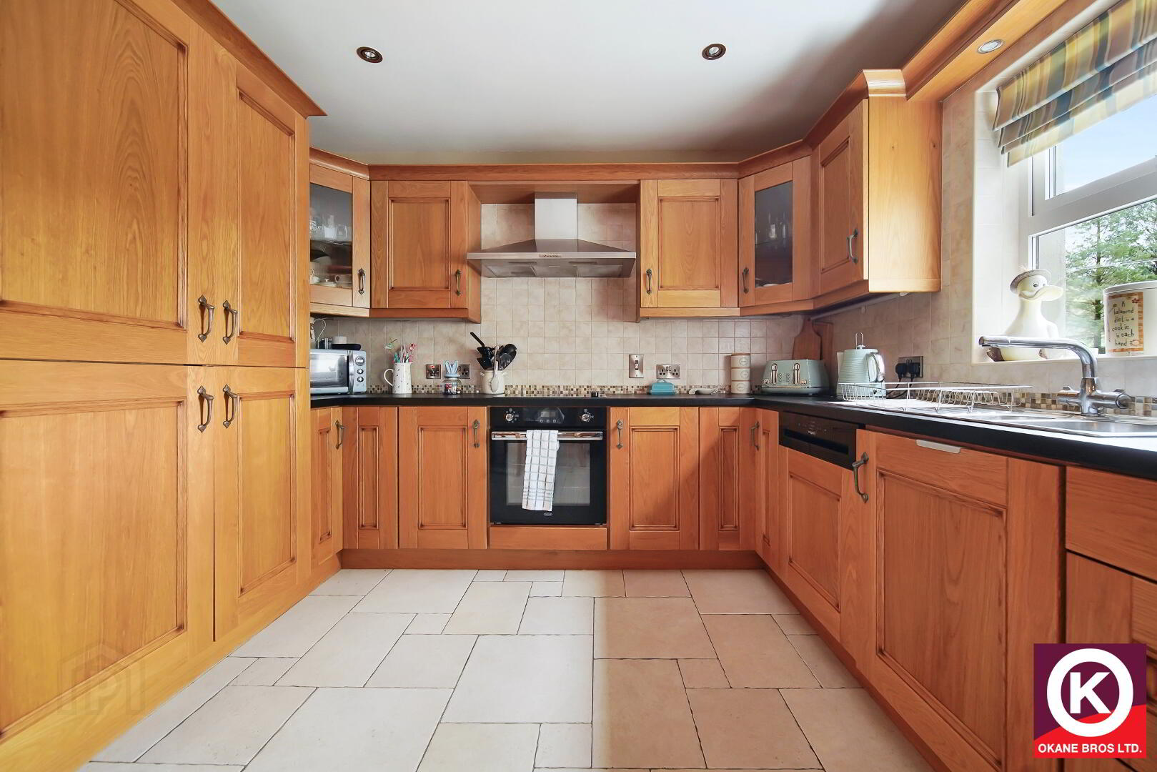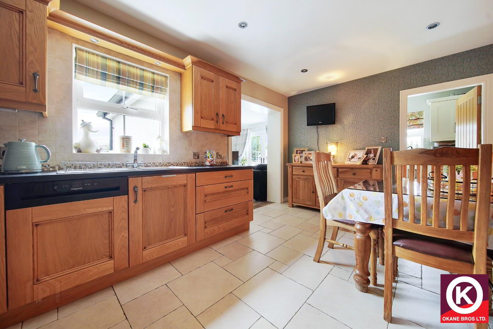 Modern solid oak high and low level units. Integrated fridge and freezer. Integrated dishwasher. Integrated electric hob, oven and grill. Tiled floor covering. Partly tiled walls. Aluminium extractor fan. Recess lighting. TV Point. Under unit lighting. Stainless Steel Sink. Open plan to Conservatory.