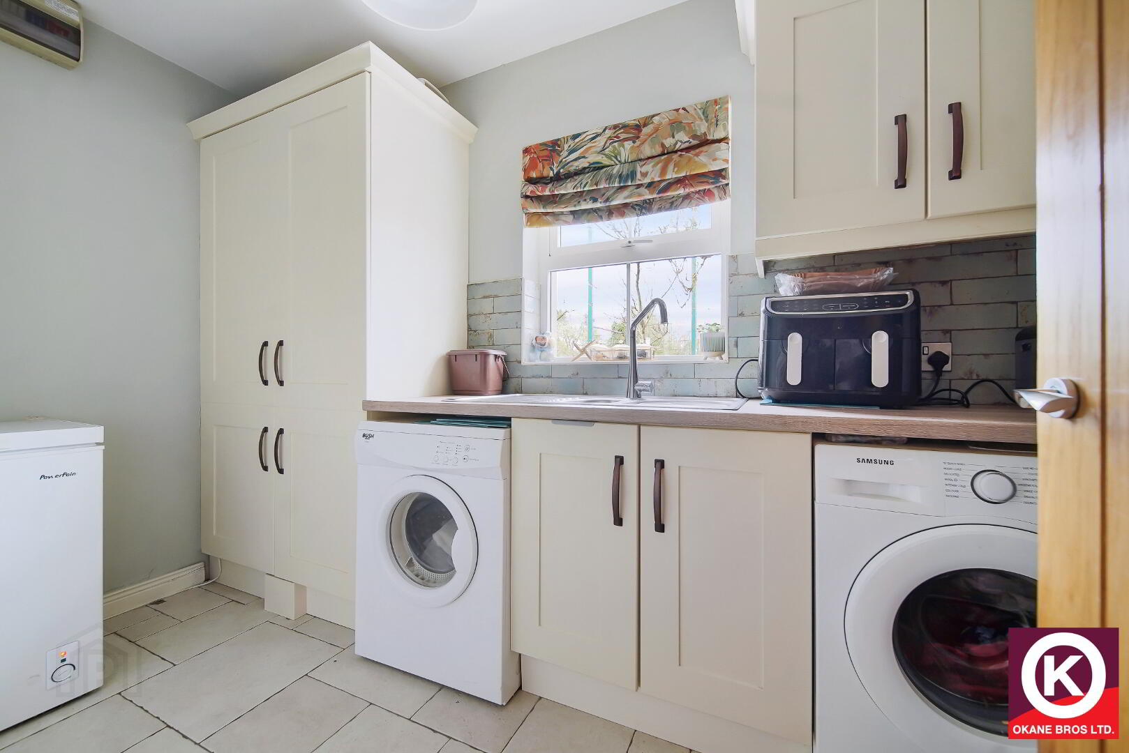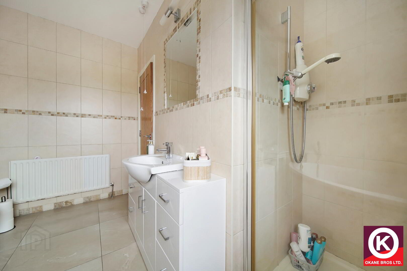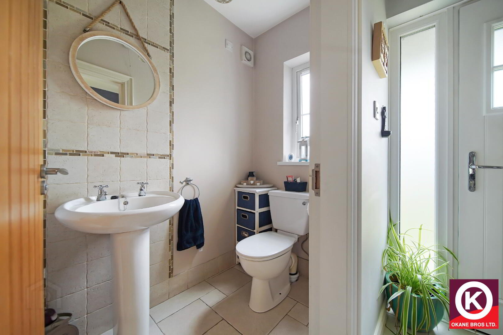 Tiled floor covering. Splash Back. Wash Hand Basin. Extractor fan.