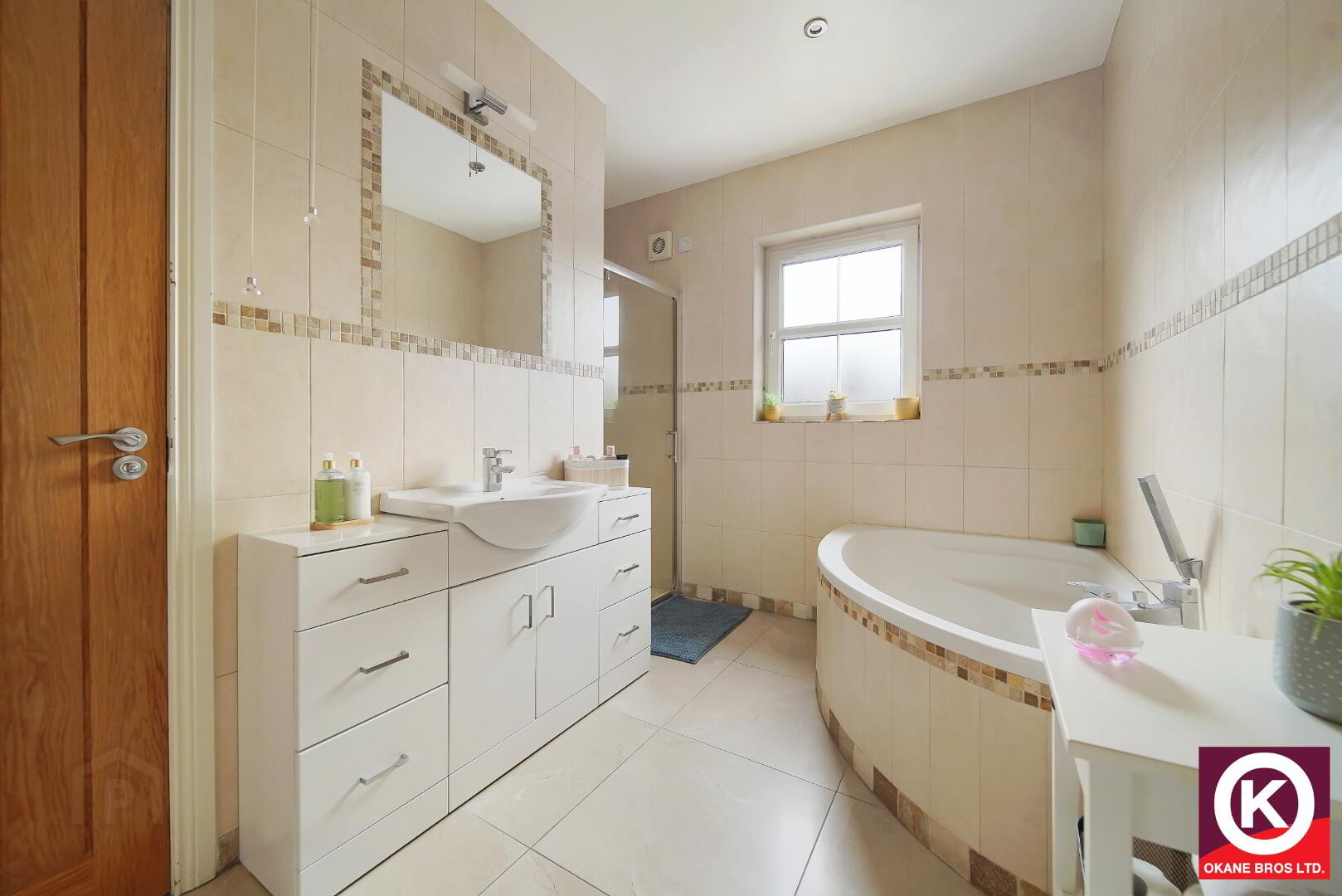Separate Corner Bath and Shower. Electric shower. Tiled floor covering and walls. Wash Hand Basin. Extractor fan. Recess lighting.