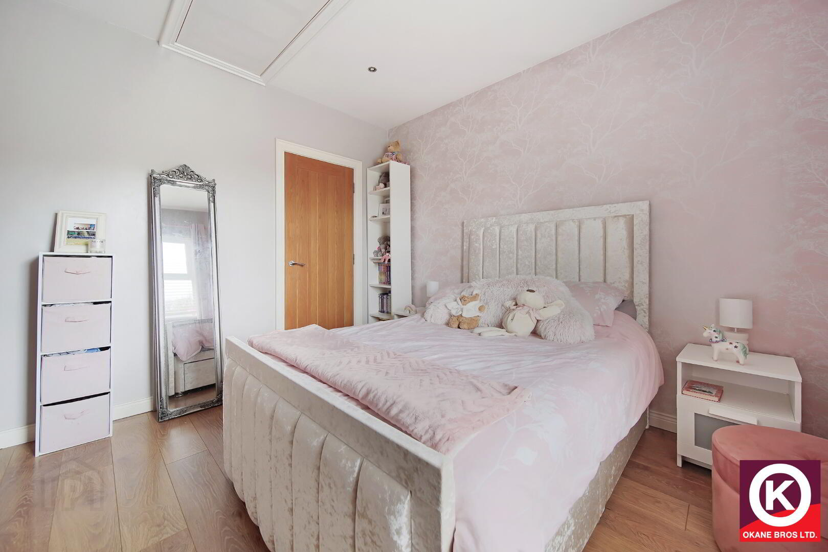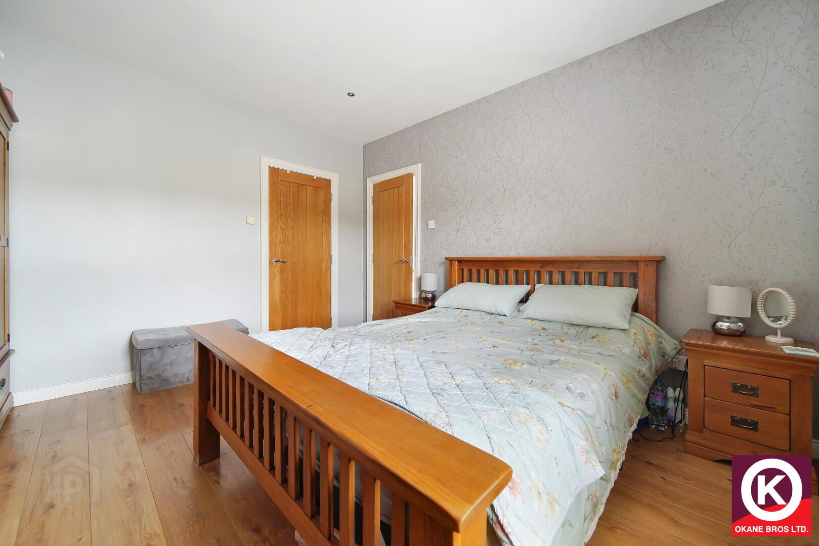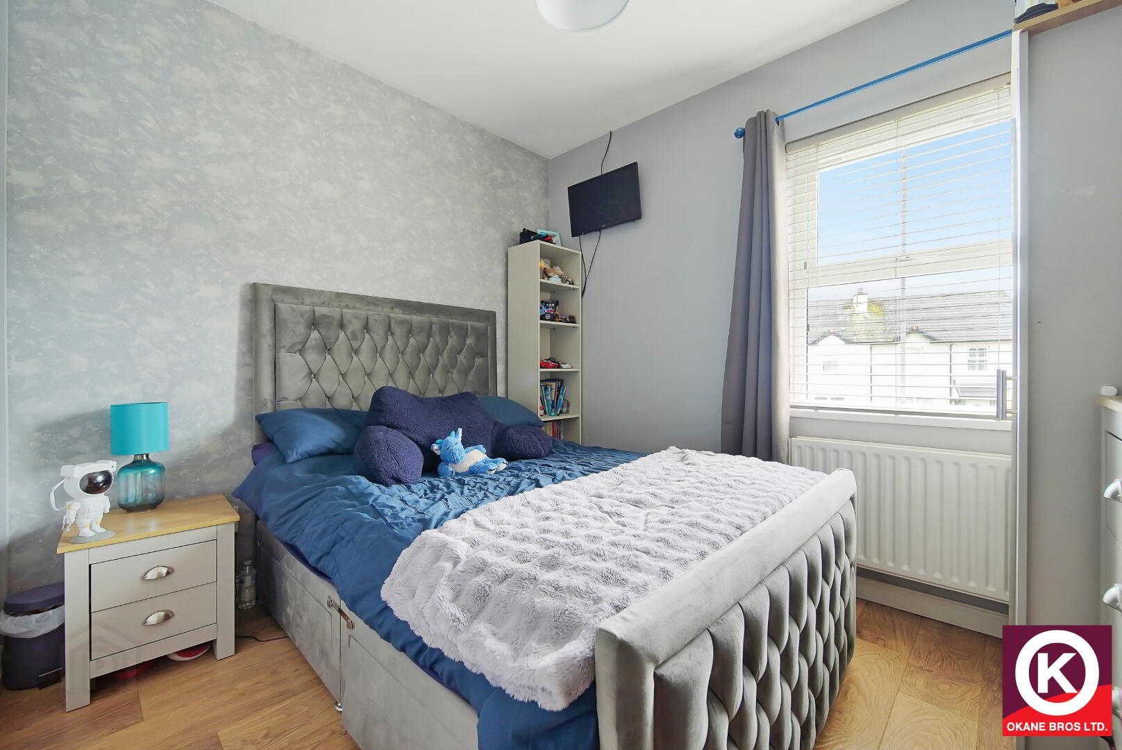 Laminate wooden floor covering. TV Point. Built-in-wardrobe. Recess lighting.