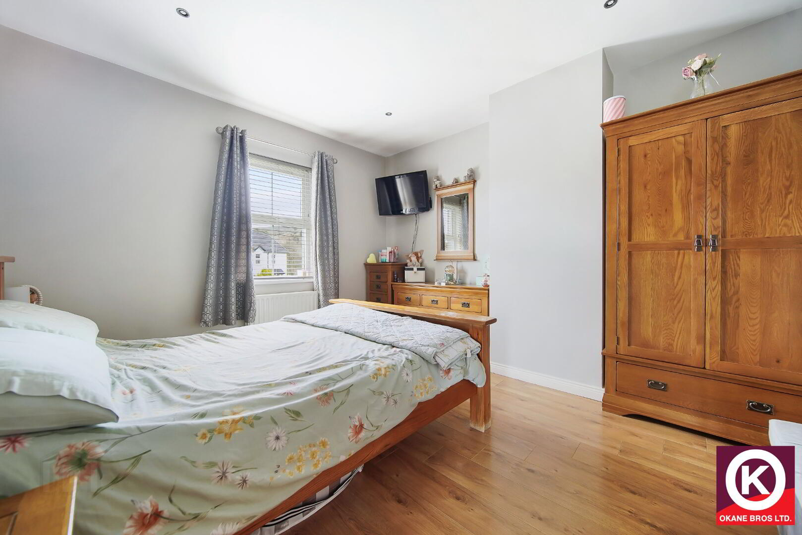 Laminate wooden floor covering. Built-in-wardrobe. Recess lighting. TV Point.
