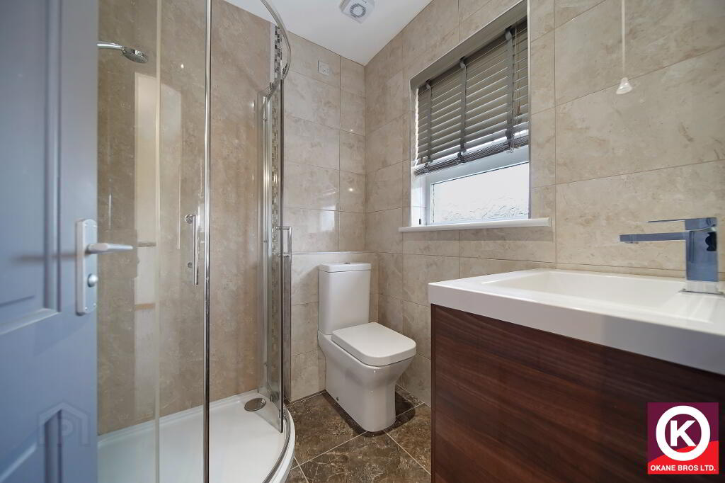 Part wooden panel wall. Separate bath and shower. Mains shower. PVC Panelling to internal shower walls. Extractor fan. Wash Hand Basin.