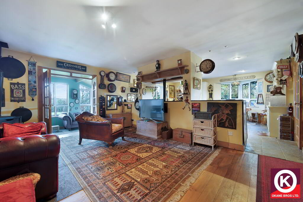 Reclaimed French oak floor covering. French doors to sunroom. Tv Point.