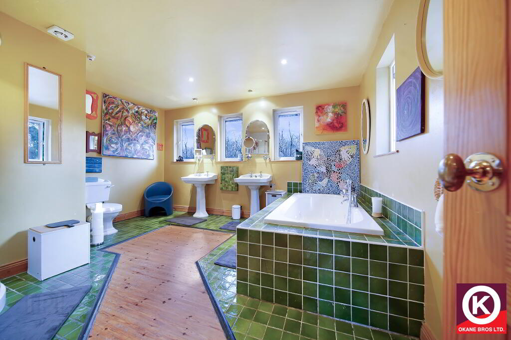Partly tiled floor. Part wooden floor. Jacuzzi style bath. Separate mains shower. 2 No. Wash Hand Basins. Recess lighting. Extractor fan.
