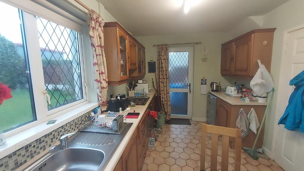 Fitted high and low level units. Tiled floor covering. Stainless Steel Sink. Electric hob, oven and grill. Plumbed for washing machine. Extractor fan. PVC exterior door.