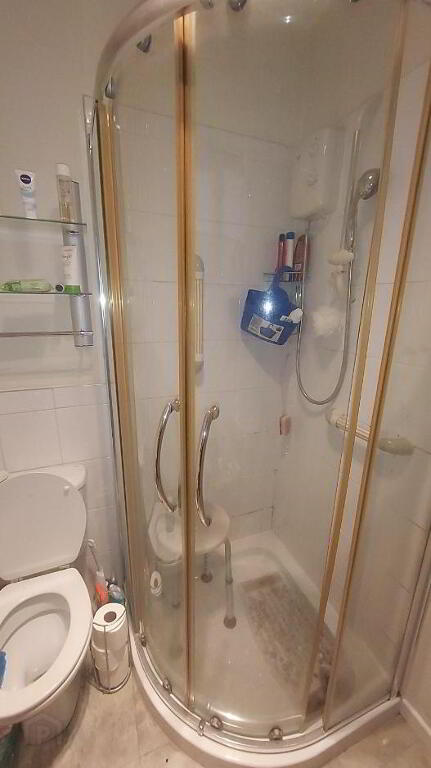 Chrome heated towel rail. Partly tiled walls. Mains shower. Wash Hand basin.