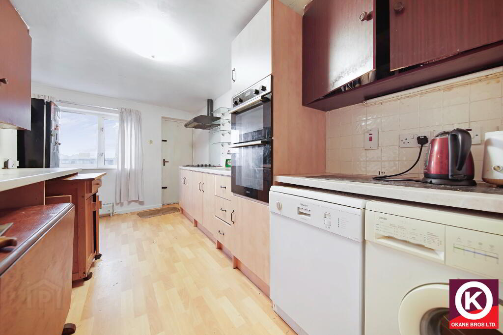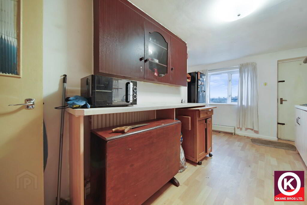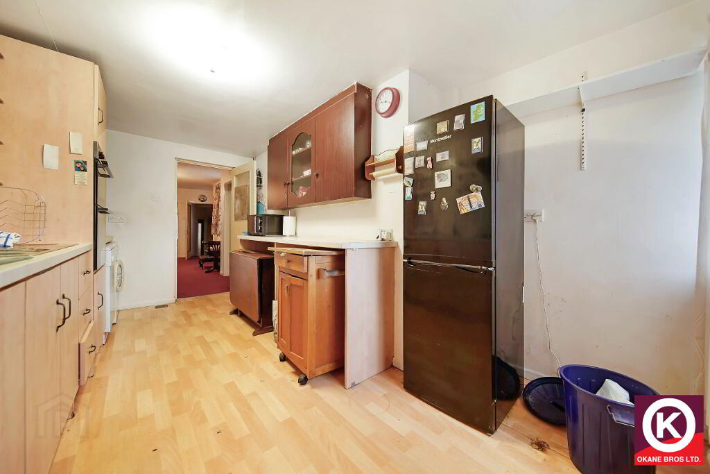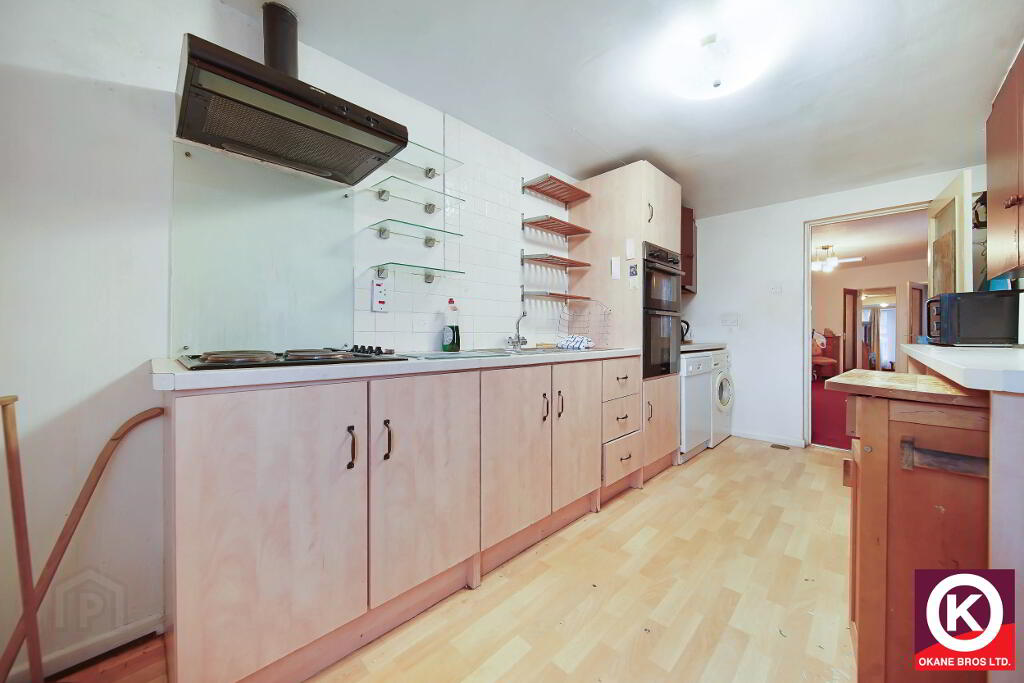 Laminate floor covering. Fitted high and low level units. Electric hob, oven and grill. Stainless Steel Sink. Door to rear garden (via steps).